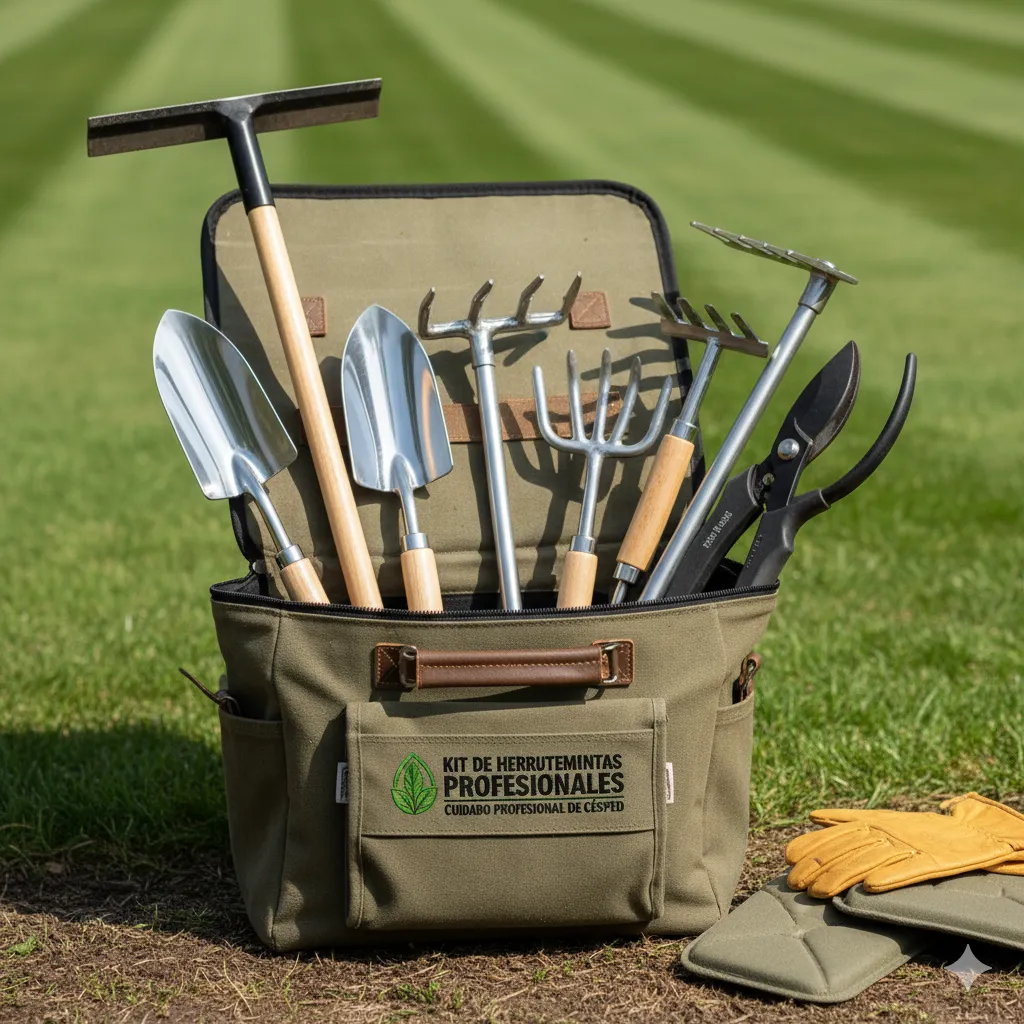 Conjunto completo de herramientas de jardinería incluyendo rastrillo, pala, podadora y accesorios para mantenimiento básico del césped. Fabricadas con materiales duraderos.